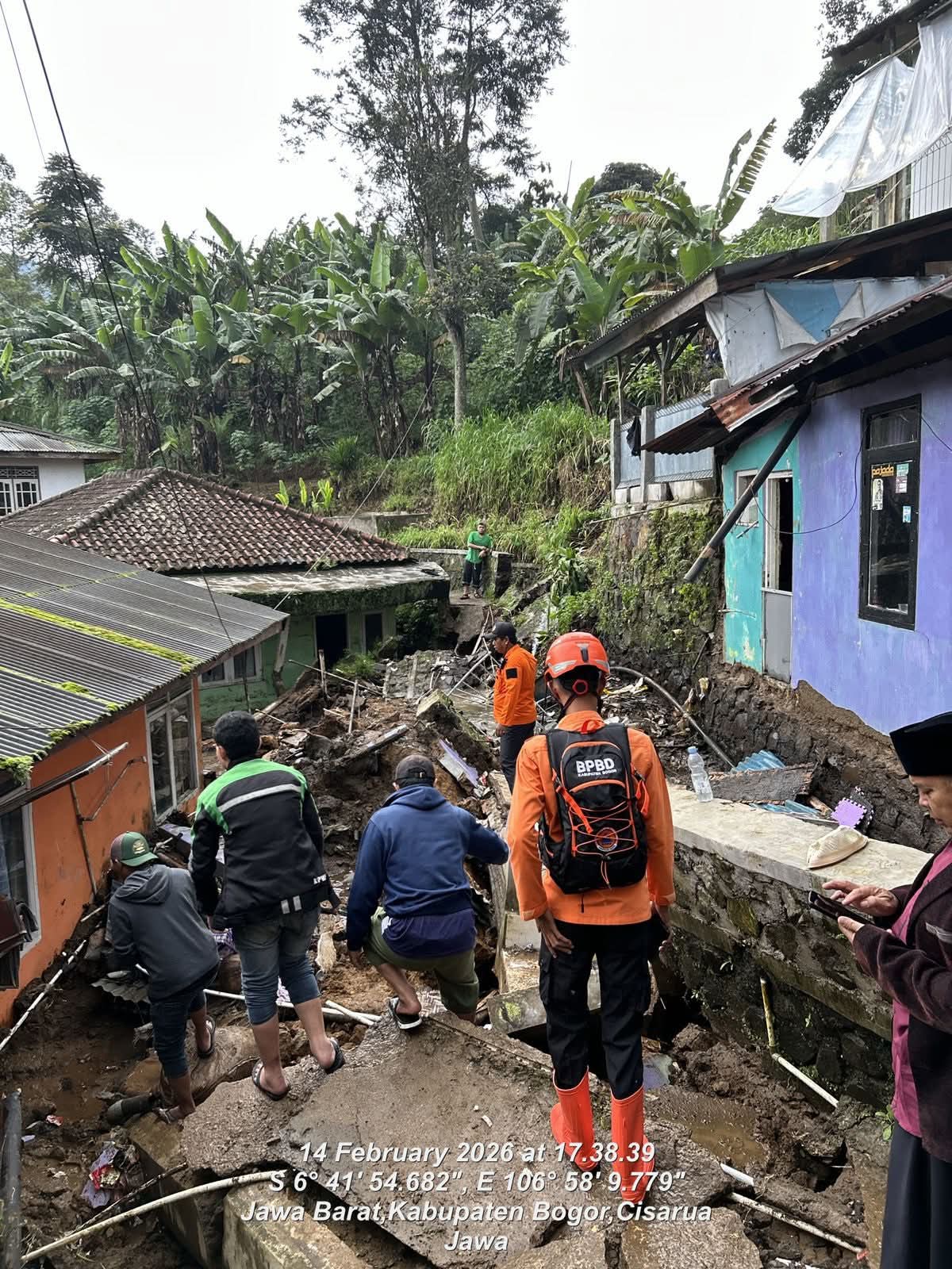 Sementara itu, tanah longsor terjadi di Kabupaten Bogor, Provinsi Jawa Barat, pada Sabtu (14/2) sekitar pukul 16.30 WIB. Hujan dengan intensitas tinggi dan durasi yang cukup lama menyebabkan meluapnya aliran air drainase, sehingga tembok penahan tanah (TPT) jebol dan memicu longsoran. Material tanah serta luapan air kemudian masuk ke rumah warga dan menyebabkan kerusakan pada sejumlah bangunan.
