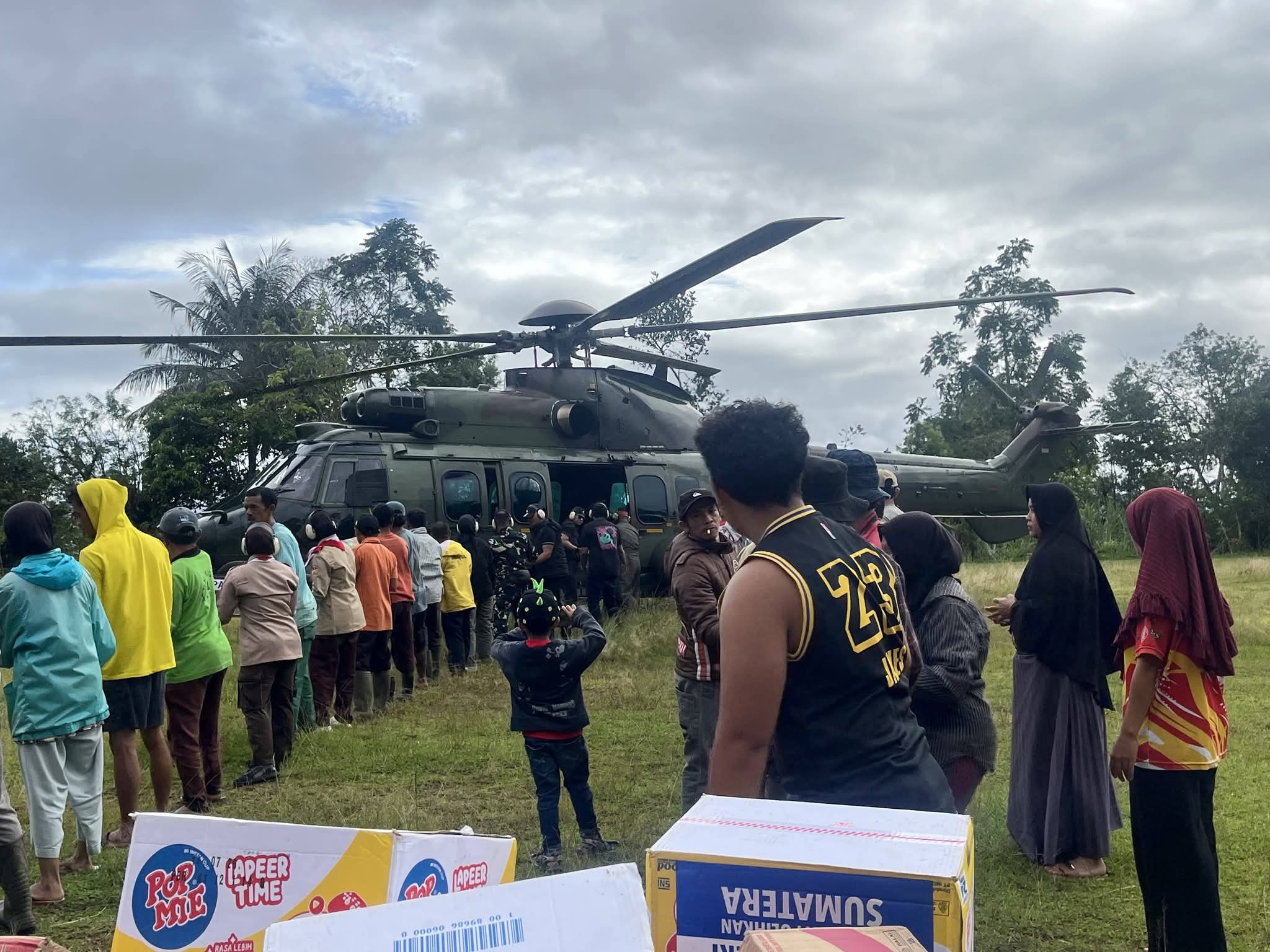 Cakrawalaasia.news, Aceh – Distribusi bantuan bagi warga terdampak longsor dan banjir bandang di Sumatera Barat kembali dilakukan Lanud Sutan Sjahrir menggunakan helikopter Caracal EC-725/H225M HT-7206, Senin (8/12/2025). Upaya ini ditempuh karena akses darat ke sejumlah wilayah masih terputus akibat material longsor dan lumpur.