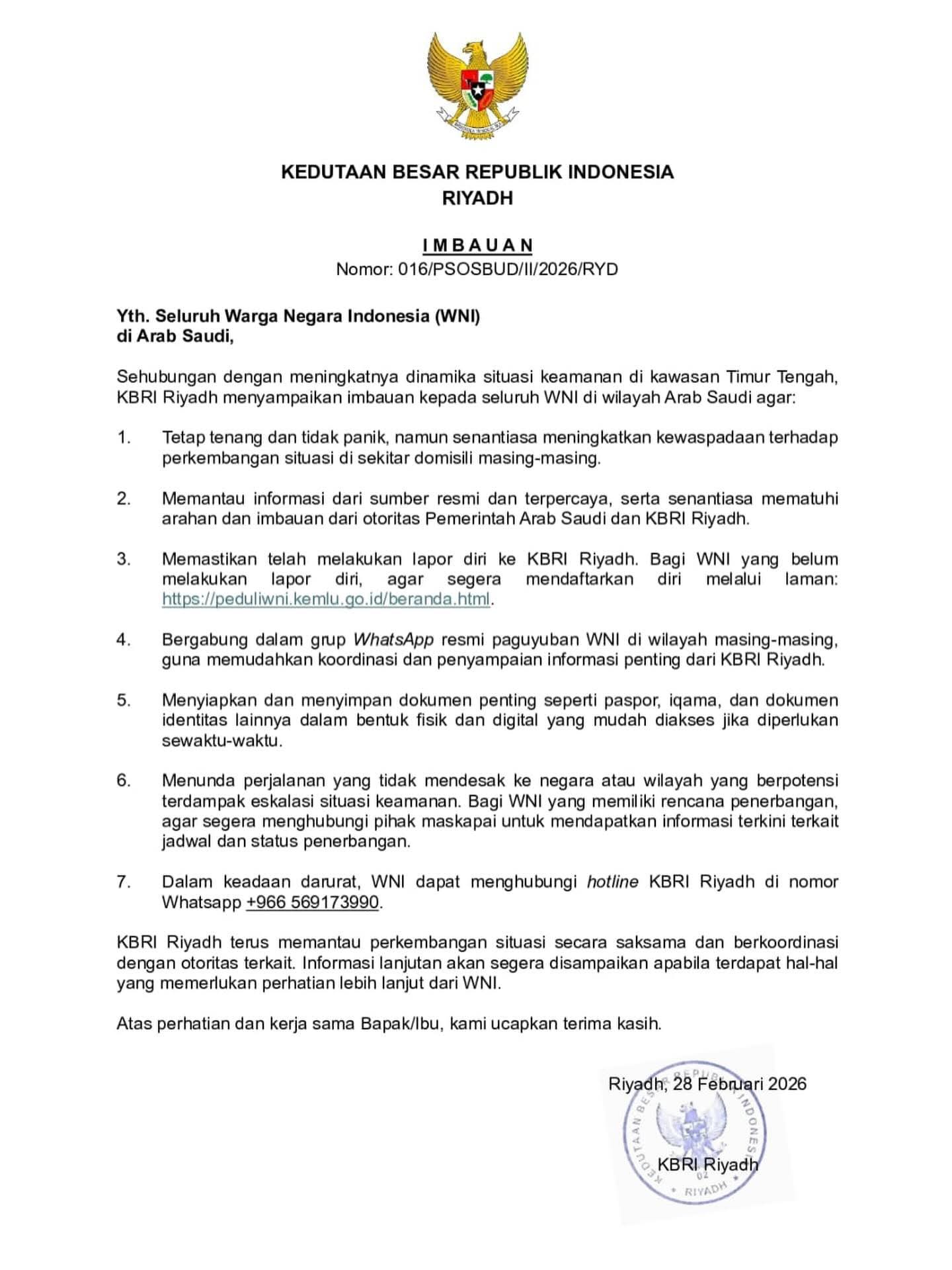 KBRI Riyadh terus memantau perkembangan situasi secara saksama dan berkoordinasi dengan otoritas terkait. Informasi lanjutan akan segera disampaikan apabila terdapat hal-hal yang memerlukan perhatian lebih lanjut dari WNI.