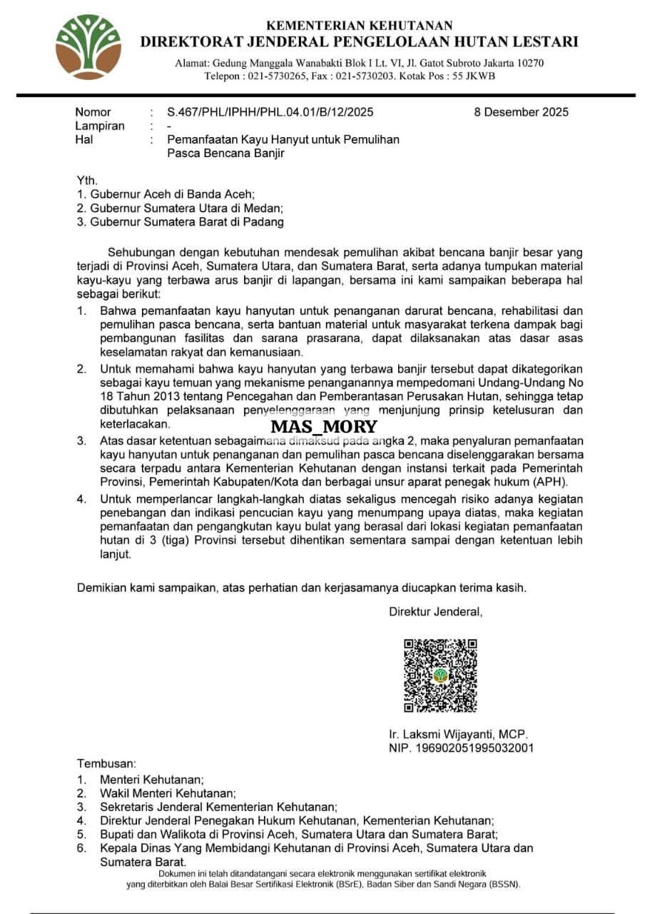 Menindaklanjuti hal tersebut, Kementerian Kehutanan melalui Direktorat Jenderal Pengelolaan Hutan Lestari menerbitkan surat bernomor S.467/PHL/IPHH/PHL.04.01/B/12/2025 tertanggal 8 Desember 2025 yang ditujukan kepada Gubernur Aceh, Gubernur Sumatera Utara dan Gubernur Sumatera Barat.
