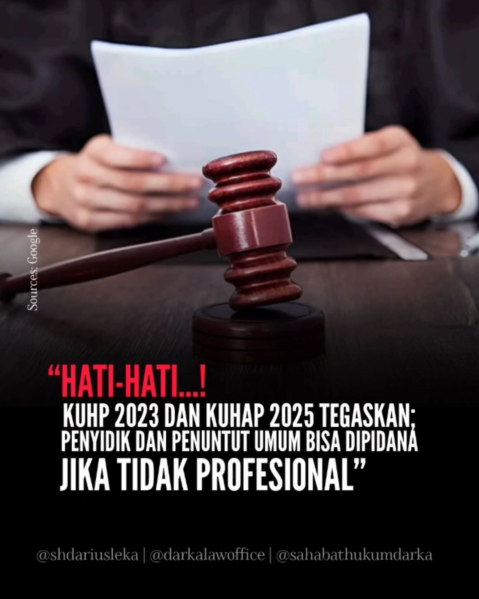 Darius Leka, S.H., M.H., Seorang advokat yang aktif dalam edukasi hukum masyarakat menyatakan; “KUHP 2023 dan KUHAP 2025 adalah peringatan keras. Penyidik dan penuntut umum bukan penguasa mutlak. Mereka adalah pelayan hukum. Jika mereka lalai atau sengaja melanggar, masyarakat berhak menuntut pertanggungjawaban pidana. Ini bukan sekadar etika, tapi kewajiban hukum.”