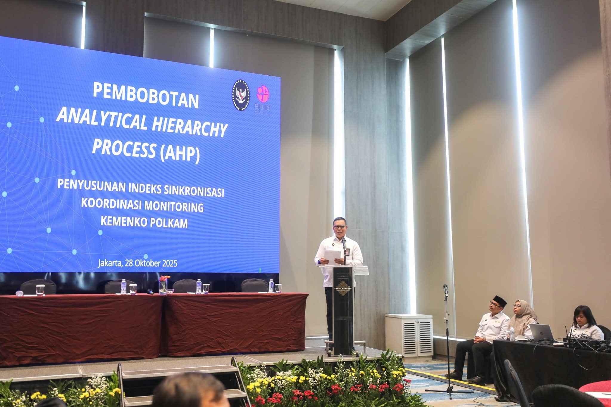 Cakrawalaasia.news, Jakarta – Kementerian Koordinator Bidang Politik dan Keamanan (Kemenko Polkam) melaksanakan kegiatan Pembobotan Analytical Hierarchy Process (AHP) sebagai tahapan penting dalam penyusunan Indeks Sinkronisasi, Koordinasi, dan Monitoring (ISKM) di Jakarta, Selasa (28/10).