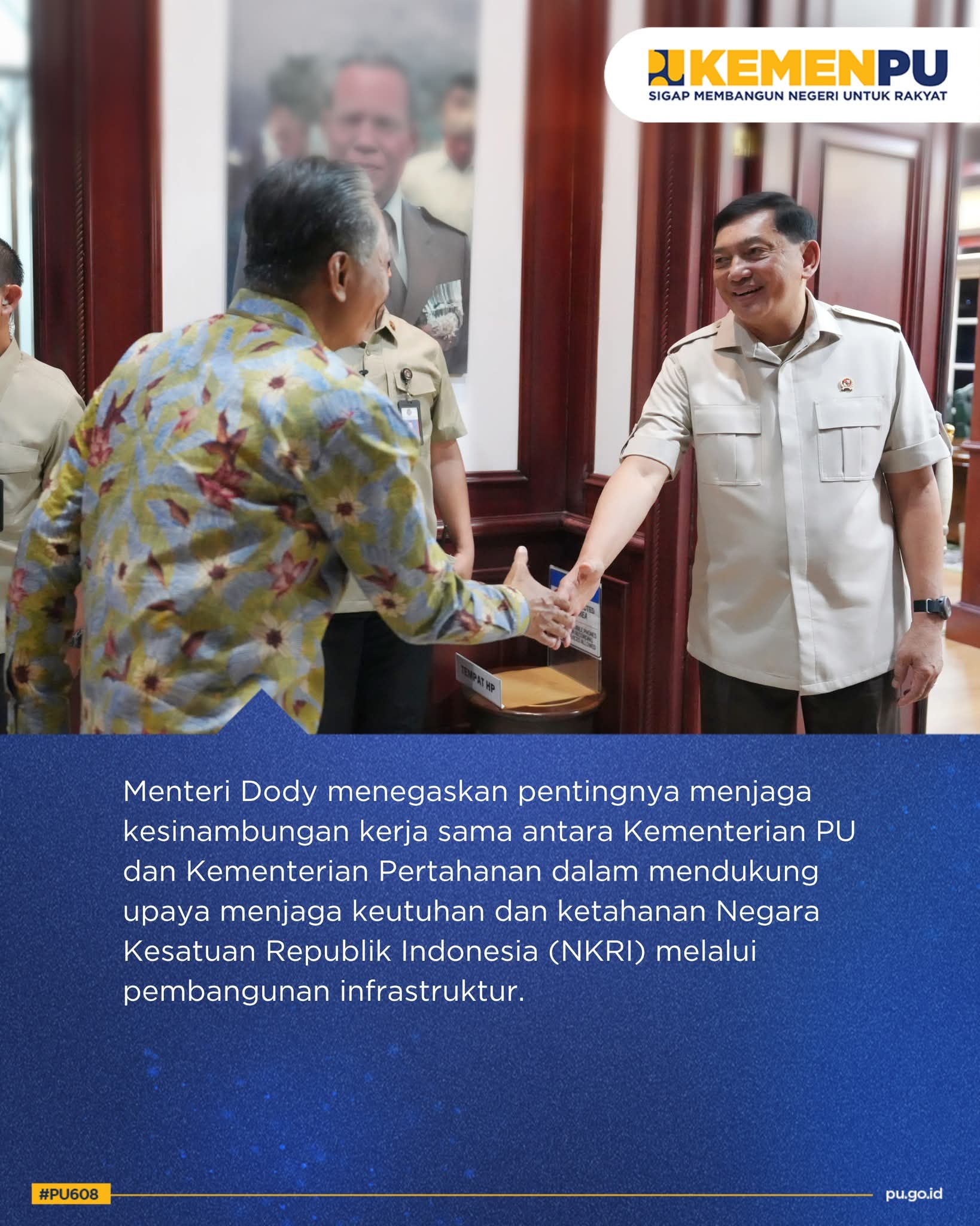 Menteri Dody menegaskan, pentingnya menjaga kesinambungan kerja sama antara Kementerian PU dan Kementerian Pertahanan dalam mendukung upaya menjaga keutuhan dan ketahanan Negara Kesatuan Republik Indonesia (NKRI) melalui pembangunan infrastruktur.
