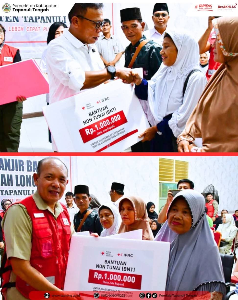 Sementara itu, Ketua Bidang Kesehatan dan Sosial, Palang Merah Indonesia (PMI) Pusat Dr. Cri Sajjana Prajna Wekadigunawan, MPH, Ph.D, menyampaikan, Bantuan ini didukung melalui pendanaan Disaster Response Emergency Fund (DREF) dari International Federation of Red Cross and Red Crescent Societies (IFRC). Melalui program tersebut, sebanyak 1.320 kepala keluarga di Kabupaten Tapteng akan menerima bantuan tunai sebesar Rp. 1.000.000 per Kepala Keluarga (KK) yang disalurkan melalui PT Pos Indonesia..