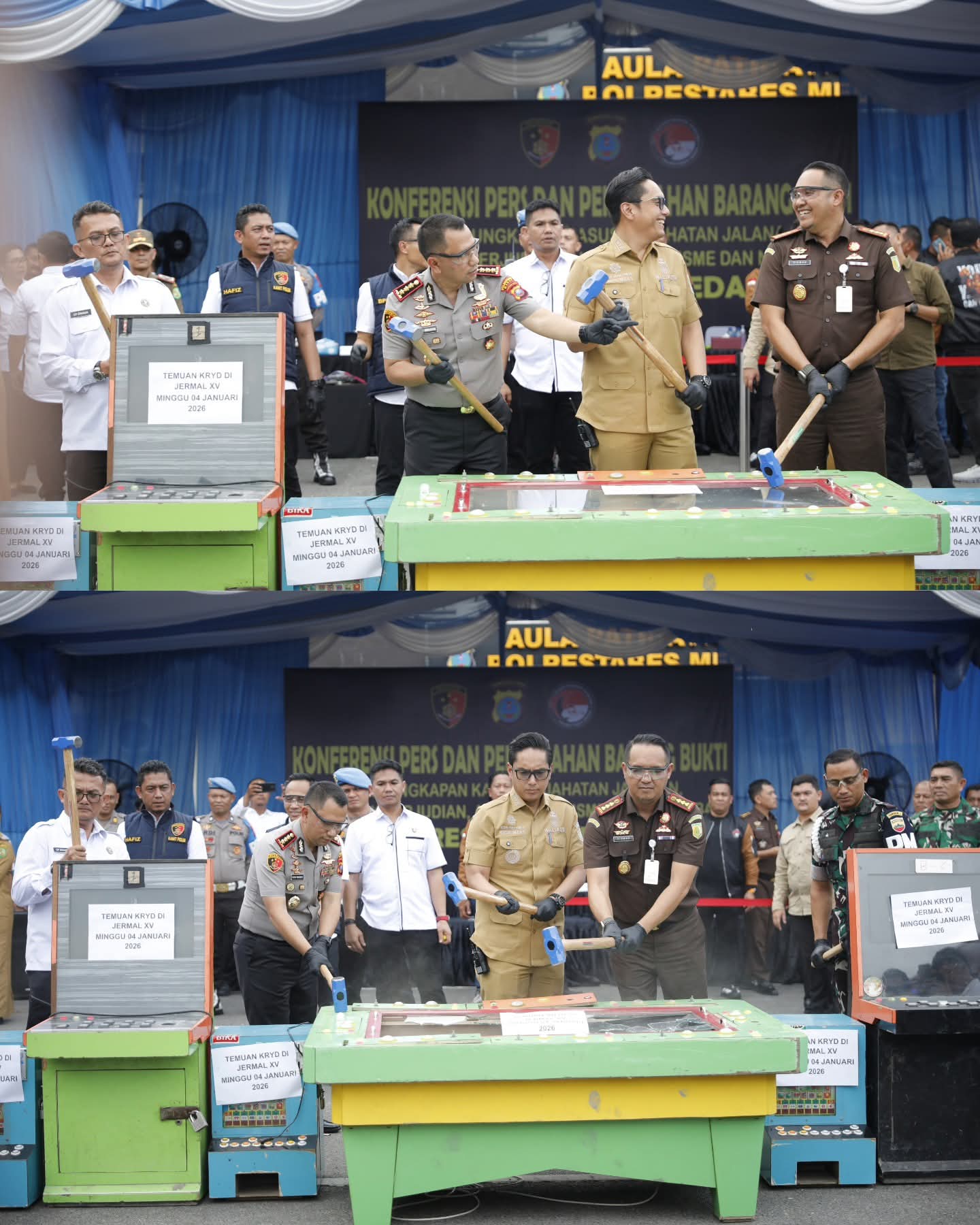 Cakrawalaasia.news, MEDAN – Konferensi pers pengungkapan kasus kejahatan jalanan, praktik perjudian, aksi premanisme, dan narkoba sekaligus pemusnahan barang bukti digelar oleh Polrestabes Medan di Mapolrestabes Medan, Senin (13/4/2026).