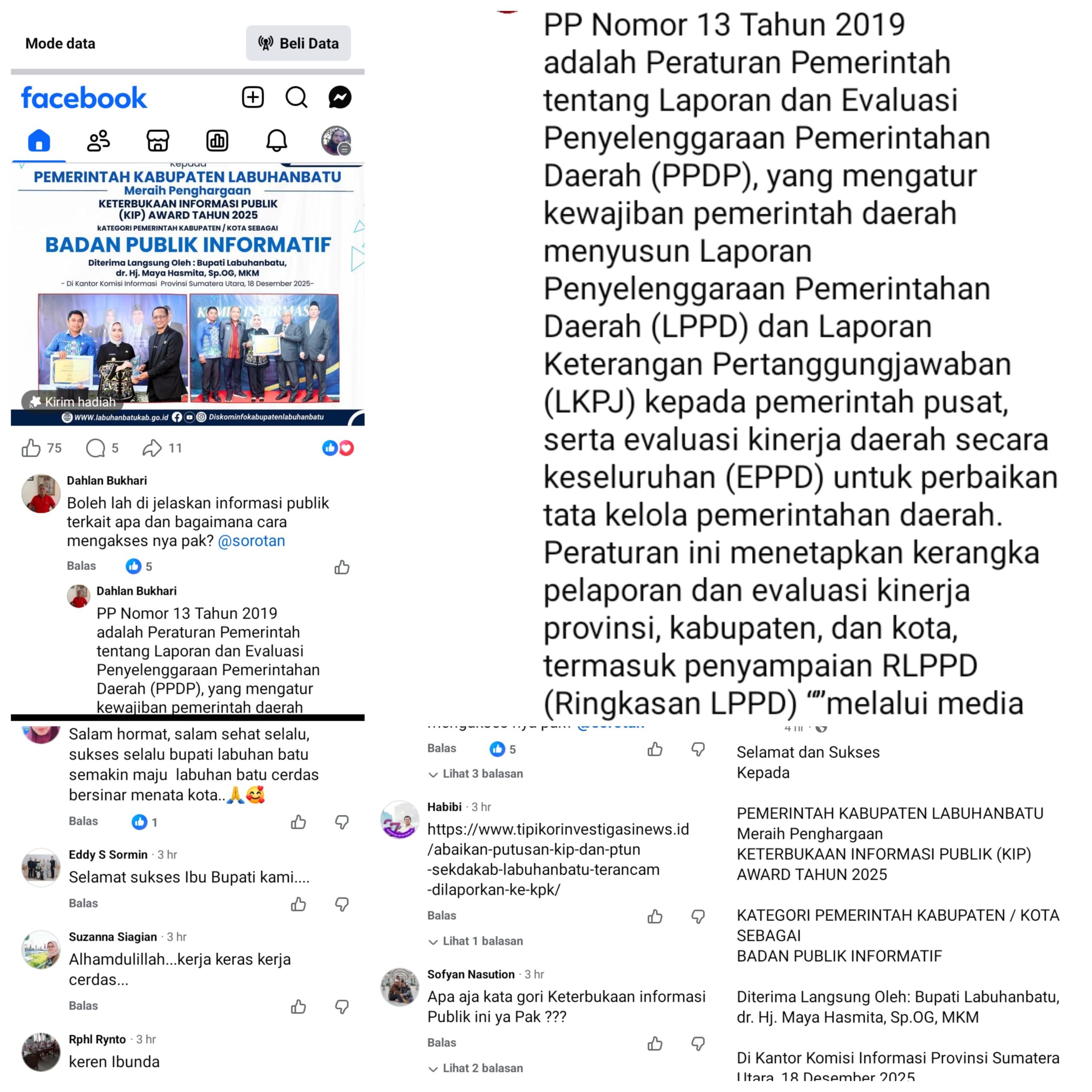 Hal pertanyaan sama dengan Dahlan Bukhari yang dilemparkan dalam kolom komentar postingan akun medsos (media sosial) Facebook Diskominfo Labuhanbatu. Di akun medsos Sofyan Nasution, juga ikut bertanya tentang peraihan penghargaan KIP Award 2025 Pemkab Labuhan Batu.