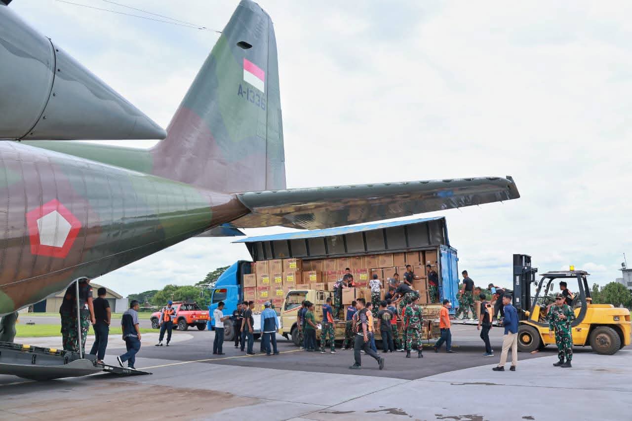 Foto : TNI AU Kerahkan Lima Pesawat untuk Angkut 1.000 Genset Ke Aceh, Sabtu (27/12/2025). (sumber : Dispen TNI AU).
